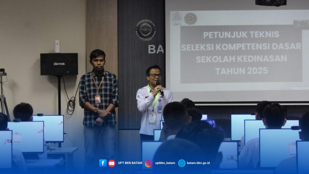 UPT BKN Batam memfasilitasi Seleksi Kompetensi Dasar (SKD) bagi peserta Seleksi Penerimaan Mahasiswa/Praja/Taruna Sekolah Kedinasan Tahun Anggaran 2025. Terdapat 6 instansi penyelenggara Seleksi Sekolah Kedinasan yang menyelenggarakan SKD di UPT BKN BATAM yakni, STIN-Badan Intelijen Negara, IPDN-Kementerian Dalam Negeri, STMKG-Badan Meteorologi Klimatologi dan Geofisika, Sekolah Kedinasan-Kementerian Perhubungan, STIS-Badan Pusat Statistik, dan PKN STAN-Kementerian Keuangan.