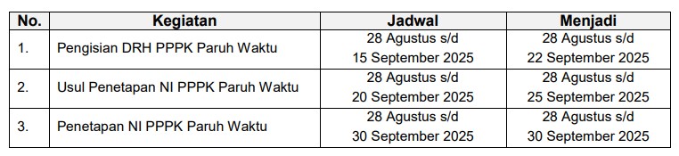 Penyesuaian jadwal pengangkatan PPPK Paruh Waktu Tahun Anggaran 2024 berdasarkan Surat Plt. Deputi Bidang Penyelenggaraan Layanan Manajemen Aparatur Sipil Negara Nomor 13834/B-KS.04.01/SD/D/2025 Tanggal 11 September 2025.